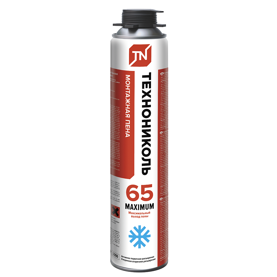 ТЕХНОНИКОЛЬ 65 MAXIMUM — представляет собой однокомпонентный полиуретановый материал в аэрозольной упаковке. Монтажная пена отличается высокой эластичностью, контролируемым объемом монтажного валика, высокими показателями тепло и звукоизоляции, активным первичным и умеренным вторичным расширением. Пена обладает хорошей адгезией к большинству строительных материалов, за исключением фторопласта, силикона и полиэтилена.