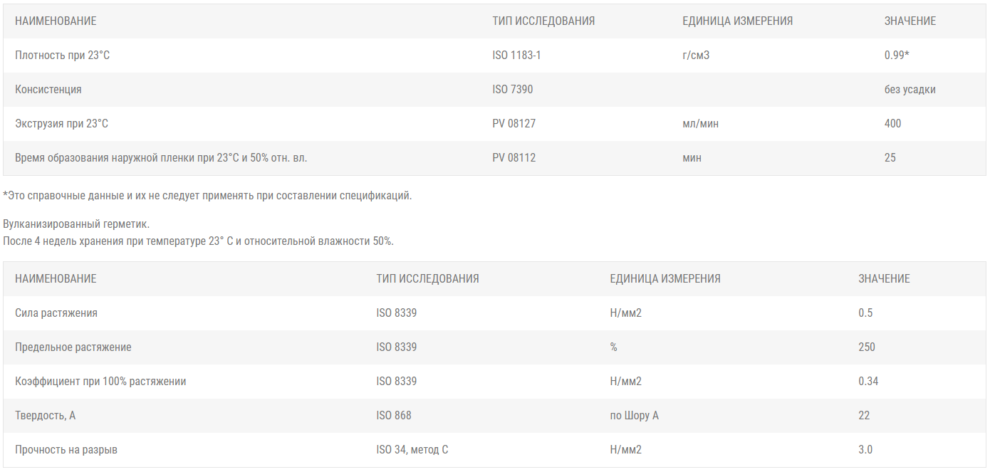Имеет высокую степень адгезии к большинству строительных материалов: дерево, бетон, кирпичи, стекло, ПВХ, пластики и различные металлические поверхности. Не вызывает коррозии металла. Устойчив к УФ-излучению и экстремальным температурам.