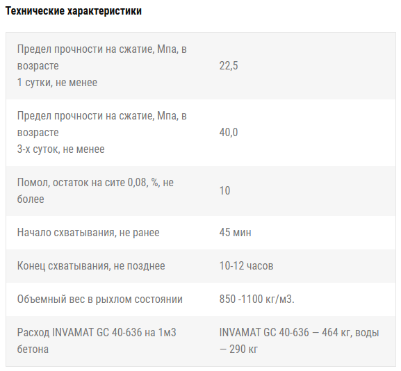 • при твердении бетона на растворе INVAMAT GC 40-636 выделяется большое количество тепла, что позволяет использовать эти бетоны при отрицательных температурах до -10 градусов без подогрева;
