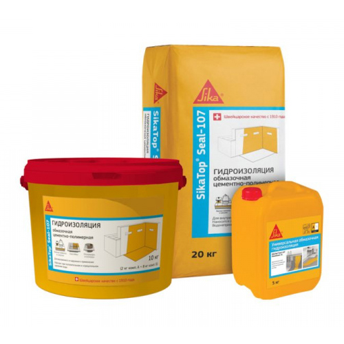 Двухкомпонентная эластичная гидроизоляция SikaTop Seal-107 Для внутренней и наружной гидроизоляции бассейнов, ванных, душевых, кухонь, балконов, террас, фундаментов, подвалов и т.п. Водонепроницаемость не менее W10. Держит отрицательное давление воды. Перекрывает трещины. Допускается к контакту с питьевой водой. Можно покрывать красками и приклеивать плитку. Не вызывает коррозии. Повышает стойкость бетона к морозу.