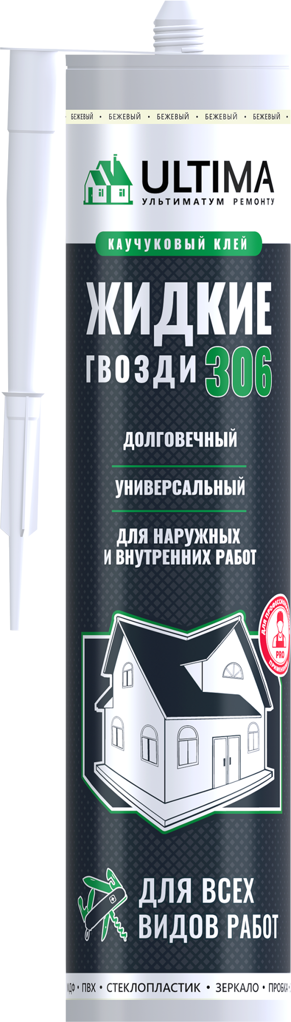 ULTIMA 306 - универсальный строительный клей на основе синтетических каучуков для различных монтажных и отделочных работ как внутри, так и снаружи помещений. Обеспечивает надежное сцепление между большинством наиболее распространенных строительных материалов, таких как: гипсокартон, керамика, дерево, ДСП, ПВХ, металл, камень, кирпич, бетон и т.д.