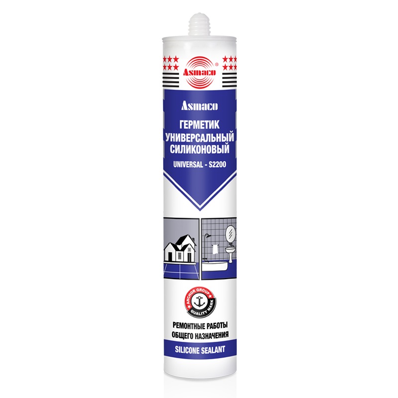 ASMACO S2200 — универсальный силиконовый ацетатный герметик, который затвердевает при реакции с влагой при комнатной температуре и формирует гибкое эластомерное соединение. Широко применяется для ремонтных работ общего назначения, в строительстве и остеклении. Легко наносится и обеспечивает отличную адгезию к непористым материалам, таким как стекло, глазурованная керамическая плитка и алюминий. Устойчив к озону и УФ-излучению.