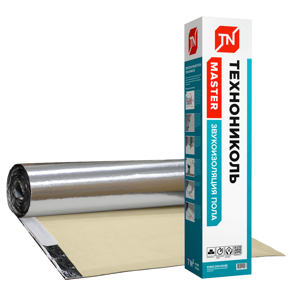 Снижение шума достигает 26 дБ, что соответствует уровню жилья повышенной комфортности. Звукоизоляция пола ТЕХНОНИКОЛЬ производится путем склейки битумным вяжущим металлизированной полиэфирной пленки со звукоизоляционным полотном.