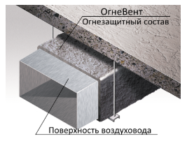 Элементы крепления воздуховодов к ограждающим конструкциям (шпильки, кронштейны) также покрываются составом ОгнеВент толщиной 1,7 мм.