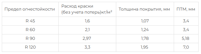 R 60 — при расходе 2,1 кг/м² толщина слоя краски 1,25 мм для 4,06 мм приведённой толщины металла;