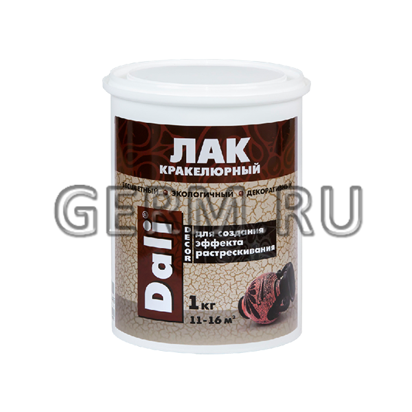 Создание эффекта растрескивания при декоративной отделке стен, потолков, колонн и других элементов интерьера Область применения КРАКЕЛЮРНОГО ЛАКА DALI-DECOR®:Область применения: внутри помещений по минеральным и деревянным поверхностям в качестве промежуточного этапа между двумя слоями различных водно-дисперсионных материалов