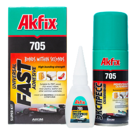 Akfix 705 — двухкомпонентный профессиональный клей, обладающий высокой прочностью и скоростью склеивания. Состоит из высоковязкого цианакрилатного клея и аэрозольного активатора.