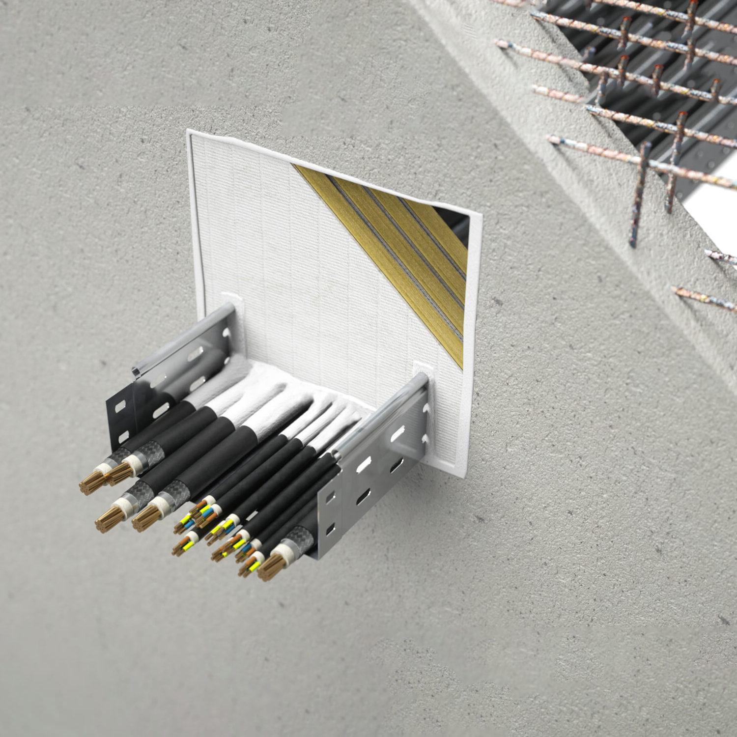 DKC Плита из минерального волокна с огнестойким покрытием 1000х500х52 мм—Минеральные плиты являются основой для монтажа огнестойких проходок в местах пересечения стен или перекрытий сложными многоярусными системами кабельных лотков. Плита состоит из минерального волокна высокой плотности (~150 кг/м3) с нанесенным на обе стороны огнестойким покрытием. Под воздействием высокой температуры (>200 °C) огнестойкое покрытие плиты вспучивается и препятствует распространению пожара, при этом плита обеспечивает необходимую теплоизоляцию.