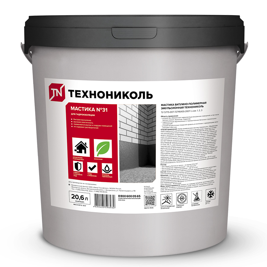 ТЕХНОНИКОЛЬ №31 — это готовый к применению материал, являющийся водной эмульсией нефтяного битума, модифицированного искусственным каучуком, технологических добавок и минеральных наполнителей. Покрытия на её основе обладают высокими: эластичностью, прочностью сцепления с основанием, теплостойкостью, устойчивостью к воздействию влаги. Не содержит растворителей.